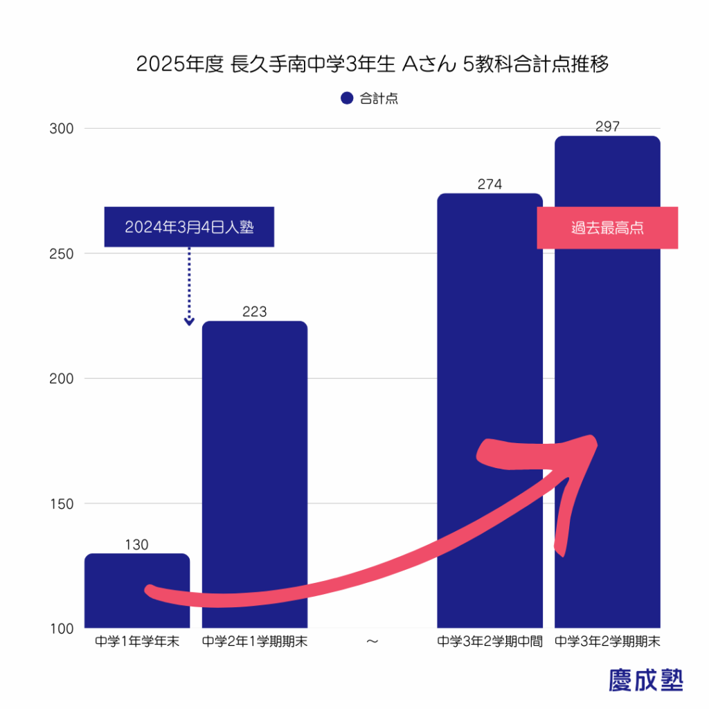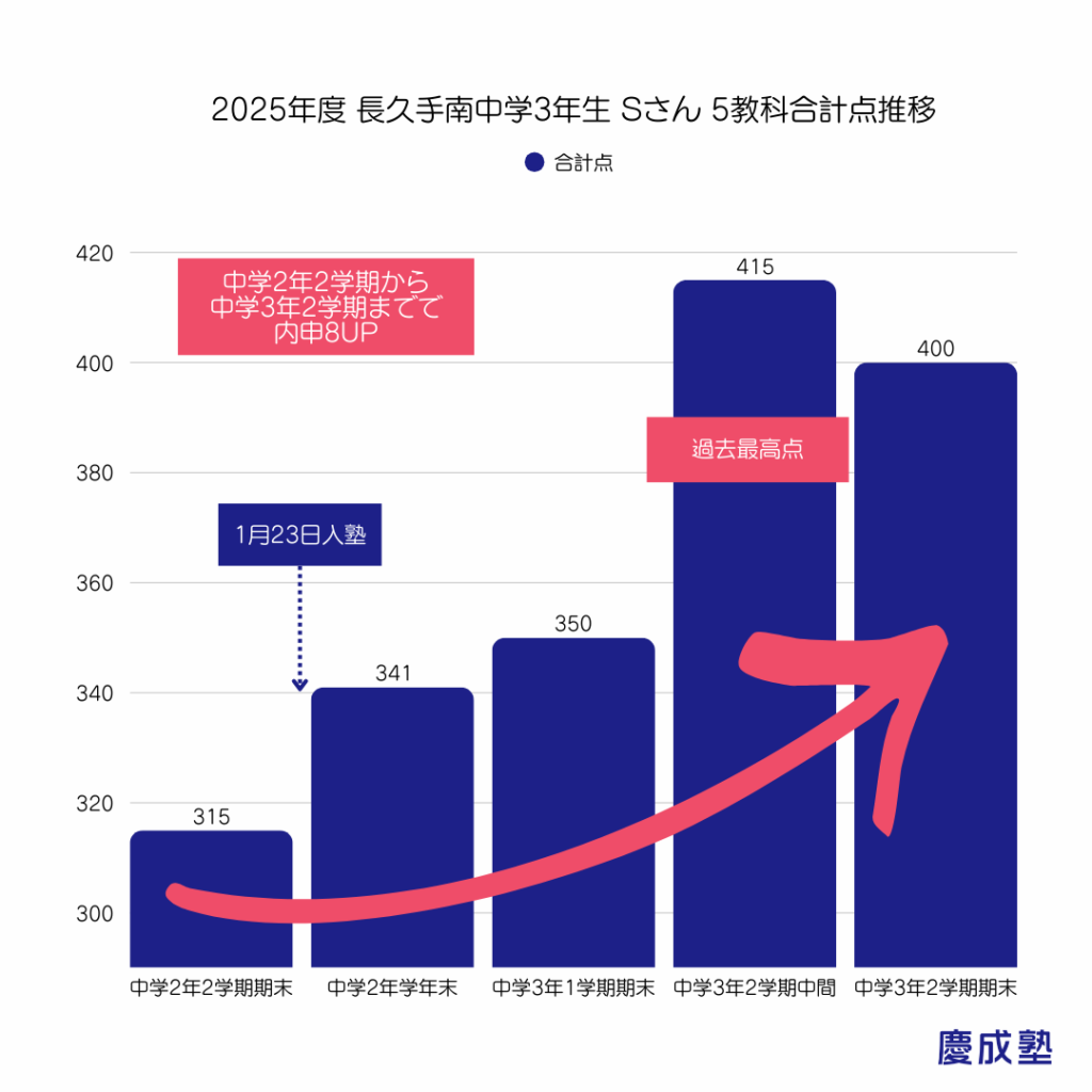 慶成塾長久手校の杉原です。 塾選びで最も大切なのは、現在の偏差値ではなく、「入塾してからどれだけ伸びるか」。当塾では、多くの生徒が中学3年生で自己ベストを更新し、志望校合格を勝ち取っています。